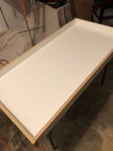 I made a few errors at this point, not concerning the form, but the function was effected. I like to use melamine because it’s strong and the surface material allows the table to be removed extremely easy without damaging either piece. I also used Green Frog tape to ensure no leaks in the creases. (This would later prove to have been a great idea if I didn’t miss something else and I still recommend it be done.)